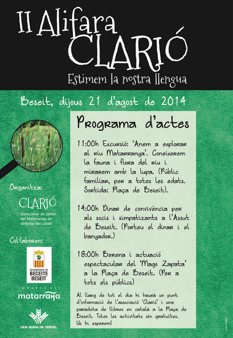 El proper dijous tindrà lloc a Beseit la II Alifara infantil que organitza anualment Clarió, una associació de pares del Matarranya dedicada a la promoció i conservació de la llengua catalana entre els menuts com a llengua materna. Amb el títol: “Estimem la nostra llengua”, s’ha organitzat una festa amb tot tipus d’activitats. Al matí hi haurà una excursió al riu per a explorar els animalets que hi viuen i conèixer amb lupa la conservació del riu Matarranya. A continuació, els participants podran col·laborar en la creació d’una escultura col·lectiva amb pedres del riu que representarà el cranc autòcton, una espècie protegida molt valorada que tenim als nostres rius. Després del dinar i l’assemblea per als socis, a la tarda tornaran els actes per a tothom amb una berena popular i la fantàstica actuació del mag Zapata.