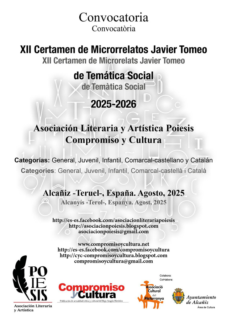 Com a tribut a l’escriptor aragonès Javier Tomeo (1932-2013) i amb la finalitat de promoure la creativitat literària i abordar la reflexió sobre el compromís de la literatura amb la realitat social, l’Asociación Literaria y Artística Poiesis i la revista Compromiso y Cultura, d’Alcanyís, convoquen el XII Certamen de Microrelats Javier Tomeo de Temàtica Social que es regirà per les següents