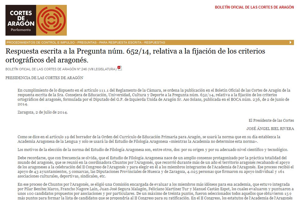 En cumplimiento de lo dispuesto en el artículo 111.1 del Reglamento de la Cámara, se ordena la publicación en el Boletín Oficial de las Cortes de Aragón de la respuesta escrita de la Sra. Consejera de Educación, Universidad, Cultura y Deporte a la Pregunta núm. 652/14, relativa a la fijación de los criterios ortográficos del aragonés, formulada por el Diputado del G.P. de Izquierda Unida de Aragón Sr. Aso Solans, publicada en el BOCA núm. 236, de 2 de junio de 2014.
