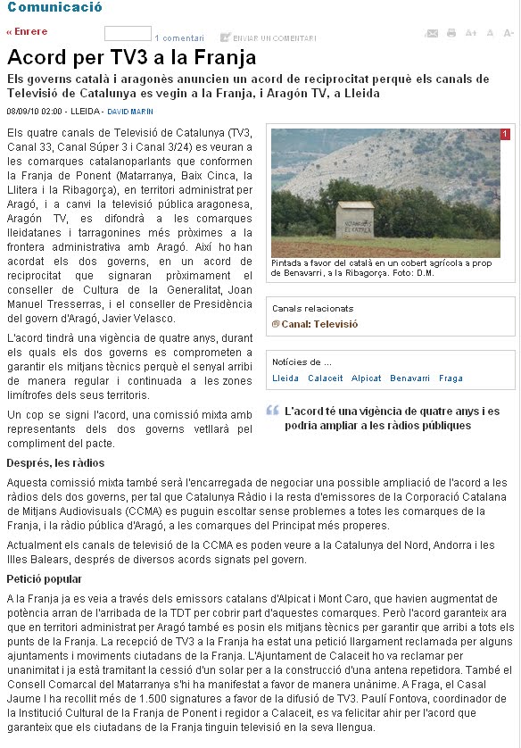 Els quatre canals de Televisió de Catalunya (TV3, Canal 33, Canal Súper 3 i Canal 3/24) es veuran a les comarques catalanoparlants que conformen la Franja de Ponent (Matarranya, Baix Cinca, la Llitera i la Ribagorça), en territori administrat per Aragó, i a canvi la televisió pública aragonesa, Aragón TV, es difondrà a les comarques lleidatanes i tarragonines més pròximes a la frontera administrativa amb Aragó. Així ho han acordat els dos governs, en un acord de reciprocitat que signaran pròximament el conseller de Cultura de la Generalitat, Joan Manuel Tresserras, i el conseller de Presidència del govern d’Aragó, Javier Velasco.