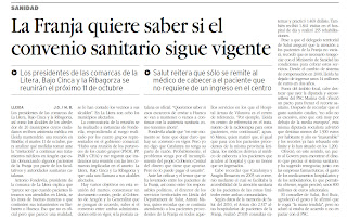 de cabecera a los pacientes que acuden al hospital y que no tienen que ser ingresados. Cabe recordar que Catalunya y Aragón firmaron en 2005 un convenio mediante el cual se facilitaba la accesibilidad de la atención sanitaria de los pacientes de las zonas limítrofes entre ambas comunidades. Según datos de la memoria de Salut del 2010, el Arnau dio 2.517 altas hospitalarias de pacientes de la Franja, realizó 27.035 consultas externas y practicó 1.469 diálisis. También recibió 1.841 visitas en el hospital de día y realizó 255 rehabilitaciones. Pese a que el delegado territorial de Salut aseguró que la atención a los pacientes de la Franja no variará, recordó que es necesario renegociar con el Ministerio de Sanidad las condiciones para cobrar estos servicios. Desde el cambio de sistema de compensación en 2009, Lleida ha dejado de ingresar unos 14 millones de euros en dos años. Fuera del ámbito local, cabe destacar que ayer la diputada y exconsellera del PSC Marina Geli ofreció un pacto para frenar el recorte sanitario. Después de recordar que el gasto sanitario catalán, “no sólo no es excesivo, sino que está muy por debajo de la media europea”, esta misma diputada socialista advirtió que destinar menos de 1.300 euros por habitante y año es “inasumible” y los recortes ya han rebasado este límite y lo han situado en los 1.200. Ofreció, en este sentido, un pacto al Govern para encontrar el dinero que precisa el sistema sanitario, y ha sugerido renegociar, junto con las empresas farmacéuticas, el gasto de los medicamentos hospitalarios y de los ambulatorios, lo que permitiría obtener, según precisó, unos 800 millones de euros adicionales. El conseller de Salut, Boi Ruiz, agradeció el gesto y le afirmó que le cogía “la mano tendida”, pero no aclaró si estaba de acuerdo o no en pactar con el PSC.