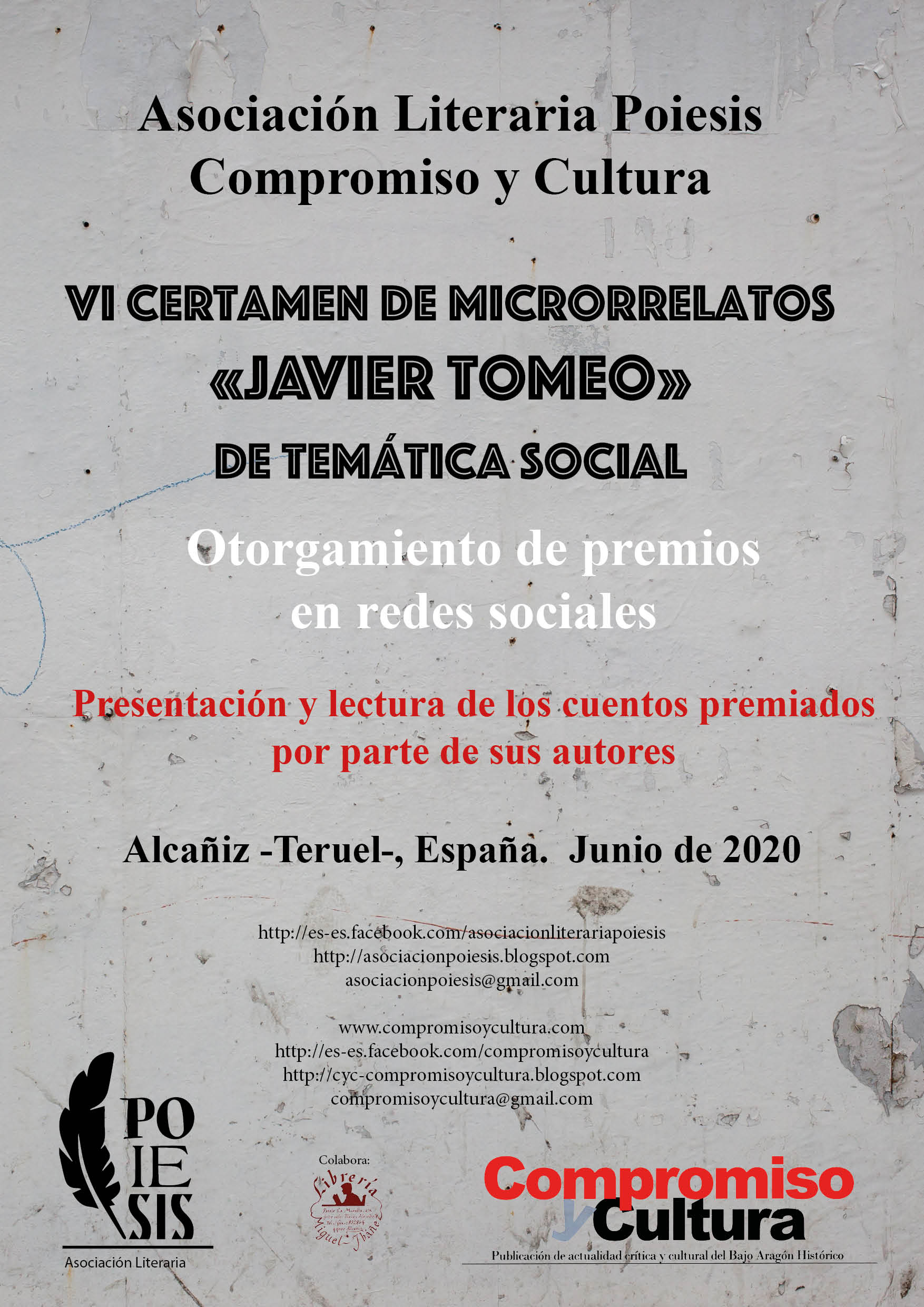 L’Asociación Literaria Poiesis i la revista Compromiso y Cultura, d’Alcanyís, han fet públic el resultat del VI Certamen de Microrrelatos «Javier Tomeo» 2019-2020 que organitzen conjuntament. Destaquem els dos contes en català entre els guanyadors. Es pot consultar els resultats, així com llegir i sentir el relats guanyadors en els comptes de Facebook i Blogguer de les dues entitats.